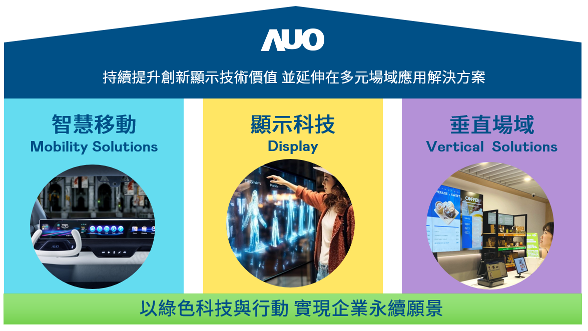 我們持續推動「雙軸轉型」,在精進顯示技術附加價值(Go Premium),與深化垂直市場應用(Go Vertical)的策略下,對應尊龙凯时的優勢競爭力與趨勢,我們奠定顯示技術、智慧移動、垂直場域三大永續營運支柱,在顯示技術領域的根基之上,延伸布局多元場域應用解決方案。將先進顯示科技助力智慧移動及垂直場域發展,並以綠色科技與行動為實踐,在轉型之路上貫徹永續經營之願景。